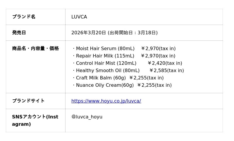 ホーユー株式会社(本社:愛知県名古屋市、代表取締役 社長執行役員:佐々木 義広、以下ホーユー)は、昨年9月に大幅フルリニューアルしたヘアプロダクトブランド「LUVCA(ラブカ)」から新たなラインナップとしてアウトバストリートメントが発売。独自処方“芯整ケア”処方を採用し、翌朝ヘアセットする際に扱いやすく美しい髪に導くことで、ありのままにヘアデザインで個性を発揮することをサポートします。2026年3月20日よりLOFT、PLAZA、Amazonにて先行販売を開始します。
