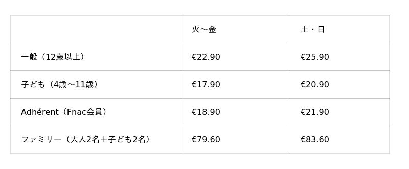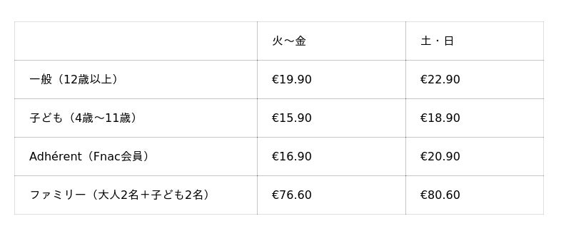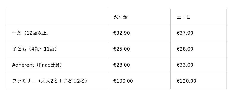 ※その他、10名以上の団体割引や、特定の月内で有効な「Billet Open(日付未指定券)」も販売されています。