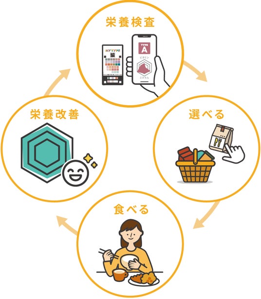 簡易尿検査キット「MY TYPE」と専用のアプリを連動させることで、「栄養タイプ」と「栄養バランス」を約1分で判定します。
