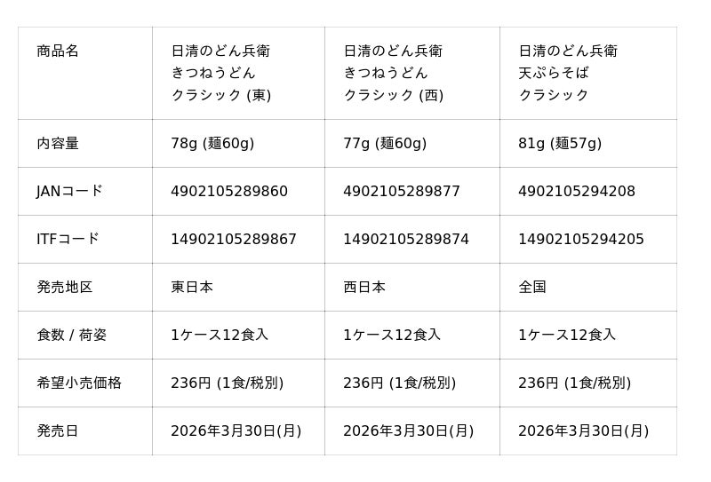 2026年8月、「日清のどん兵衛」は発売50周年を迎えます。これを記念し、50年前のレシピをもとに発売当時の味わいを再現した*「日清のどん兵衛 きつねうどん クラシック」(東日本向け、西日本向け) と「日清のどん兵衛 天ぷらそば クラシック」を2026年3月30日(月)に発売します。
