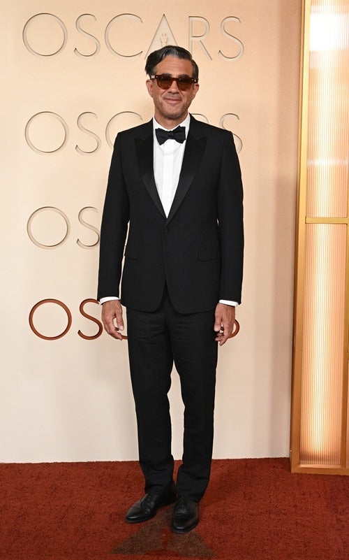 ボビー・カナヴェイルは、ブラックのウール&シルクのピークドラペルタキシードに、ホワイトのコットンシャツとブラックシルクのボウタイを合わせました。また、ブラックレザーのダービーシューズを着用しました。