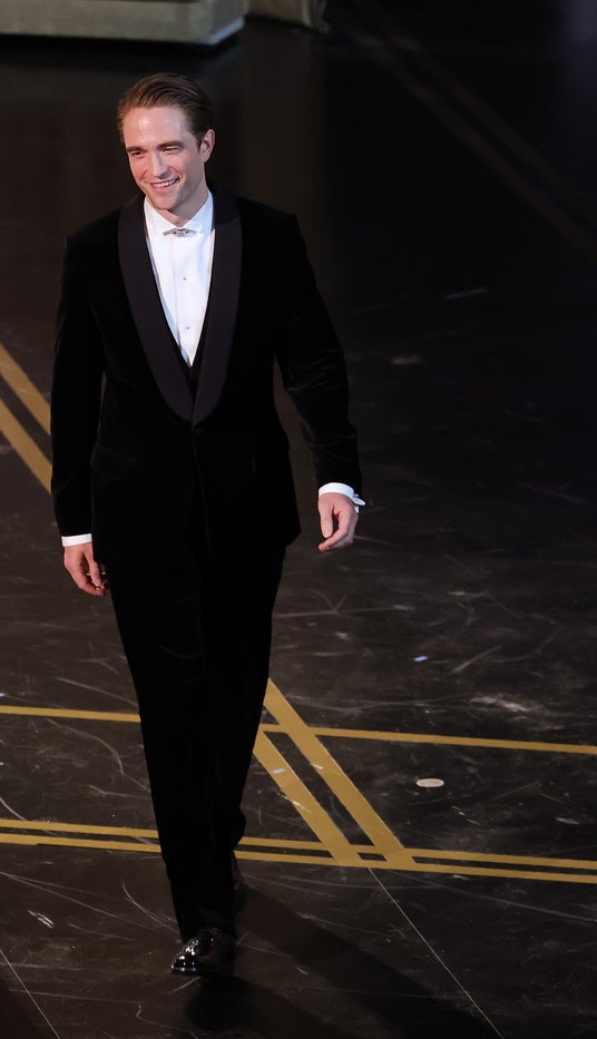 ロバート・パティンソンは、ブラックのベルベット&シルクのラペル付きタキシードに、ホワイトのコットンシャツとブラックのパテントレザーのダービーシューズを合わせた装いを披露しました。
