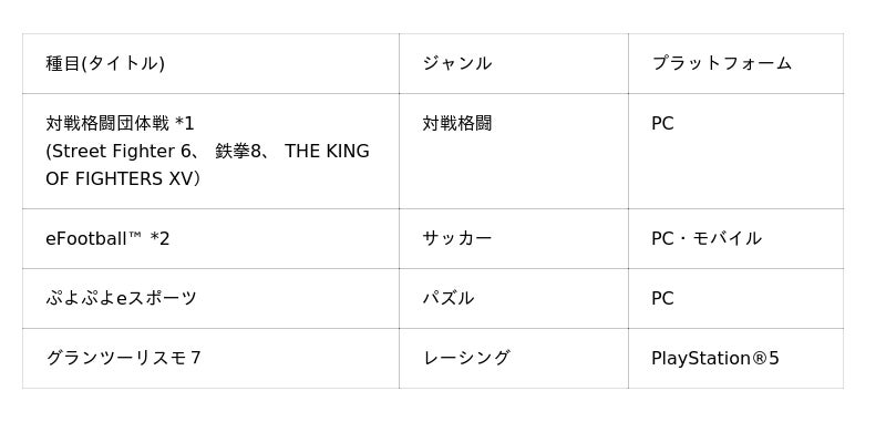 *1 「対戦格闘団体戦」種目は、各タイトル1名ずつ、合計3名の選手でチームを編成し、1つのメダルを争います。