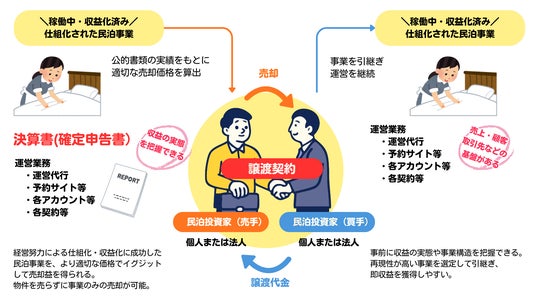 民泊ビジネスでは、「民泊の物件取得(賃貸の転貸含む)」・「民泊開業」・「許認可準備」・「民泊の運営」など多くの手間が必要です。しかし近年、民泊事業を売却する「民泊M&A」という出口戦略が注目されています。民泊M&Aを活用することで、「収益化した稼働中の民泊事業を次の投資家へ引き継ぐ」・「民泊を事業として売却する」ことが可能になる場合があります。