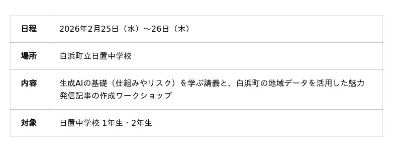 株式会社ウフル(本社:東京都港区、代表取締役社長CEO:園田 崇史 以下、ウフル)は、2026年2月25日~26日の2日間、和歌山県白浜町日置中学校の1・2年生を対象にAI活用教育プログラムを実施しました。