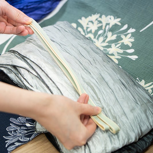 2. 洋服感覚で約5分で完成!上下セパレートの「二部式仕様」上着と巻きスカートのように分かれている上下セパレート仕様です。着付けの専門的な知識がなくても、洋服感覚でサッと羽織って紐を結ぶだけで、誰でも簡単・綺麗に着付けができます。また、着用中に着崩れてしまっても、ご自身で簡単にお直しが可能です。