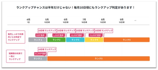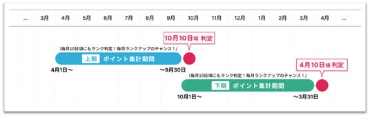 ランクは上期(4月1日~9月30日)および下期(10月1日~3月31日)の各期末の集計ポイントによって確定し、半年間継続して適用されます。また、毎月10日頃にも判定を行うため、集計ポイントが各ランクの必要ポイント数を満たした場合は、4月および10月を待たずしてランクアップすることができます。