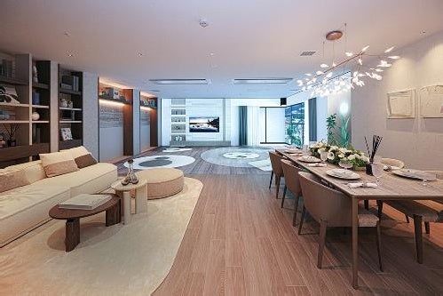 この「阪急阪神すまいのギャラリー 彩都」は、当社の新築マンション「ジオ彩都セントラルコート」や「ジオ彩都いろどりの丘」、新築戸建住宅「ジオガーデン彩都茨木」をはじめとする数々の新築物件の販売に加え、不動産の仲介サービスを提供する拠点です。当ギャラリーの最大の特徴は、「マージルーム」というモデル空間で、ディスプレイ家具を配置したその先の壁2面と床の合計3面にLEDを配し、そこに当社の新築物件の室内や、窓からの眺望の映像を流すことで、まるで実際の室内にいるような没入感の中で、ご購入後のイメージをよりリアルに感じていただける未来型の物件紹介の手法を取り入れています。当社では、販売物件ごとにモデルルームの建設と解体を行う従来の手法は環境への負荷が大きいことから、そうした販売モデルからの脱却を図ることを目指しています。