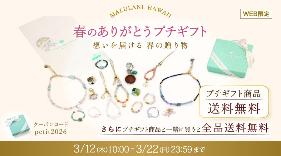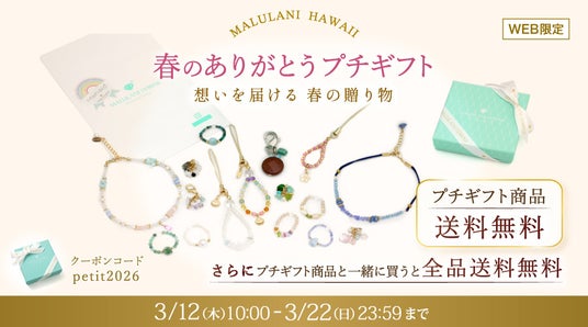 ハワイ発祥の天然石アクセサリーブランド「マルラニハワイ」は、期間限定にて「プチギフト送料無料キャンペーン」を公式オンラインショップにて開催いたします。