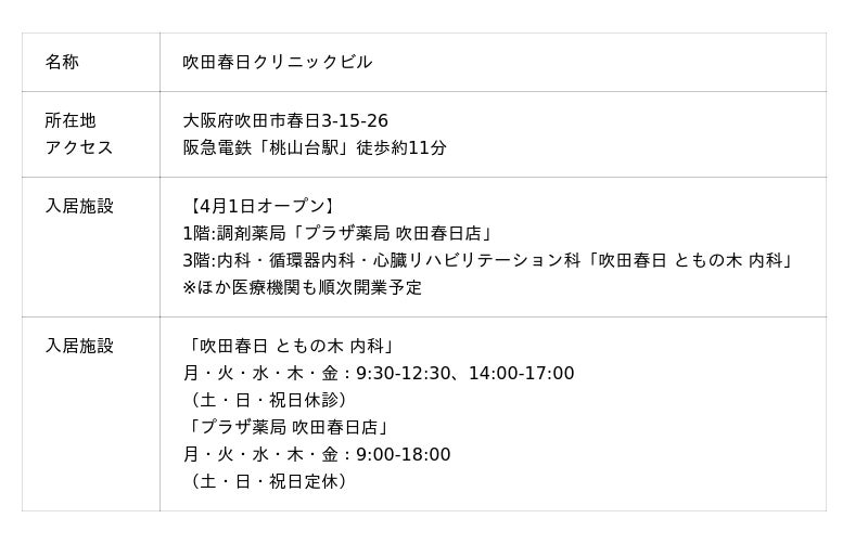 株式会社プラザ薬局(本社:大阪府八尾市、代表取締役:小田典央)は、2026年4月1日(水)に、大阪府吹田市の千里ニュータウン・桃山台に医療モール「吹田春日クリニックビル」をオープンします。第一弾として内科「吹田春日 ともの木 内科」と調剤薬局「プラザ薬局 吹田春日店」がオープンします。ほかの医療施設も順次開業予定です。