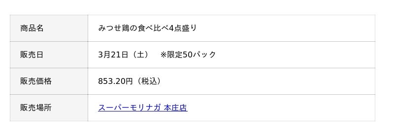 今回販売する『みつせ鶏の食べくらべ4点盛り』(価格:税込853.20 円)は、佐賀県のブランド鶏「みつせ鶏」を使い、部位ごとに味付けを変えた4種の総菜をメインに楽しめる商品です。みつせ鶏は佐賀県三瀬村で開発された赤鶏で、特有の歯切れのよさと奥深い風味が特長です。