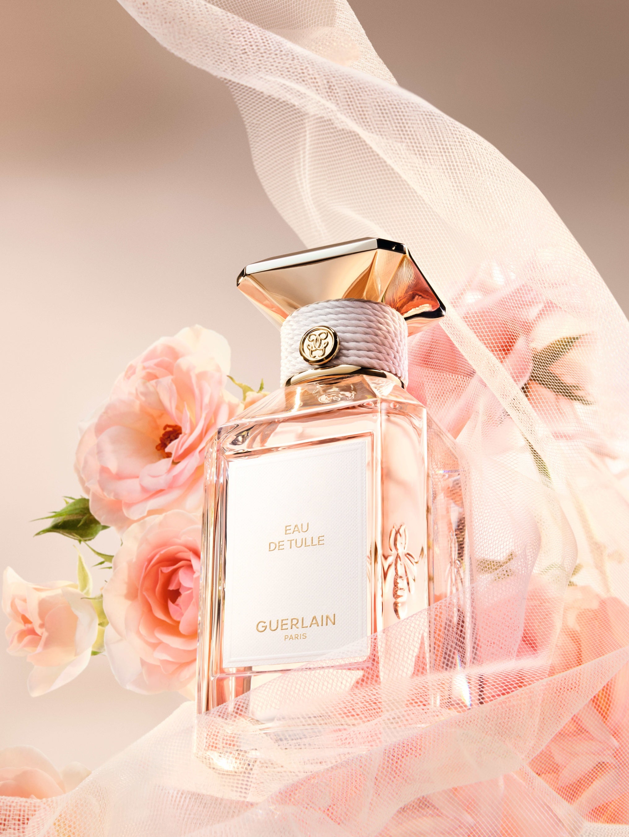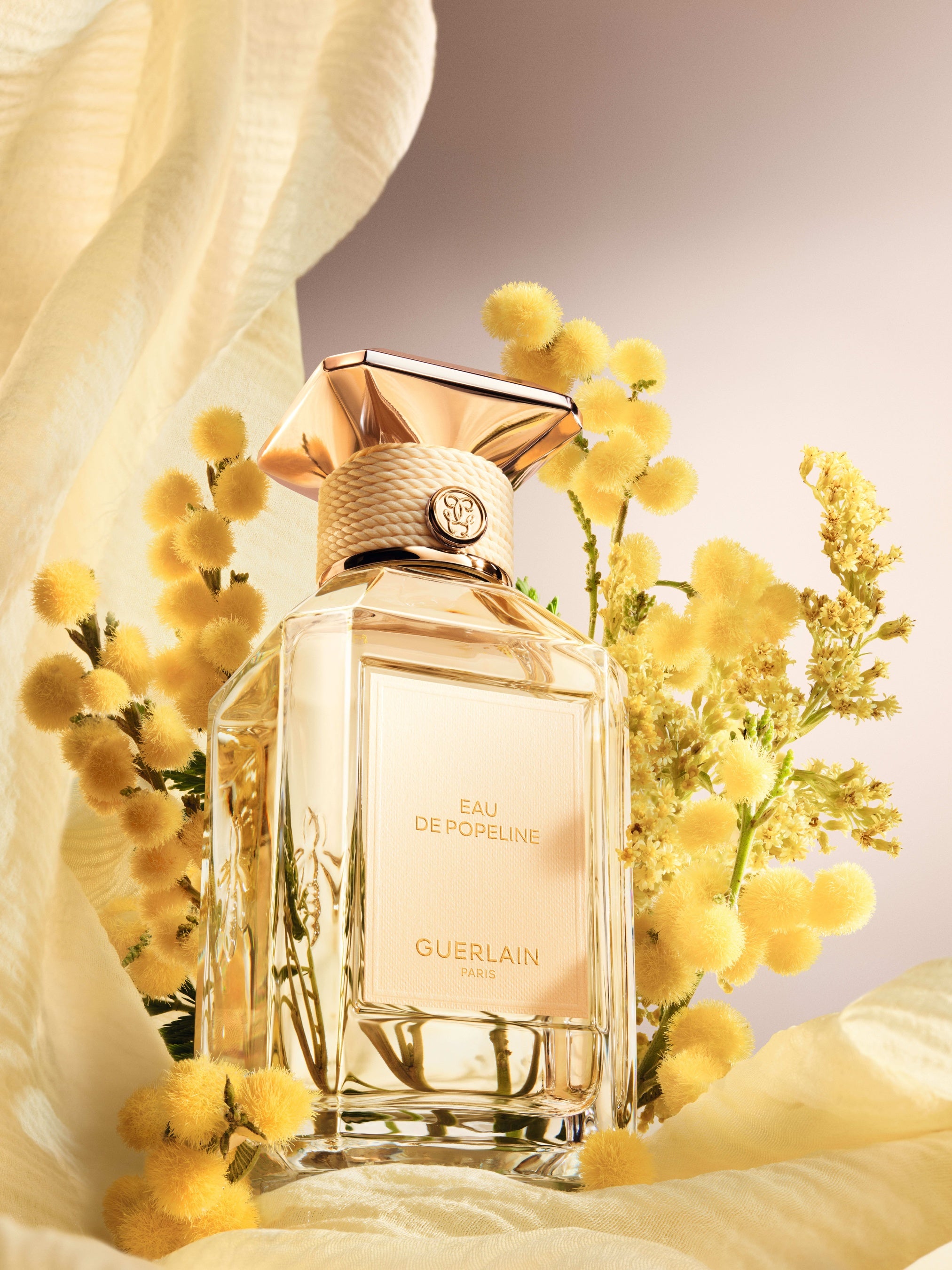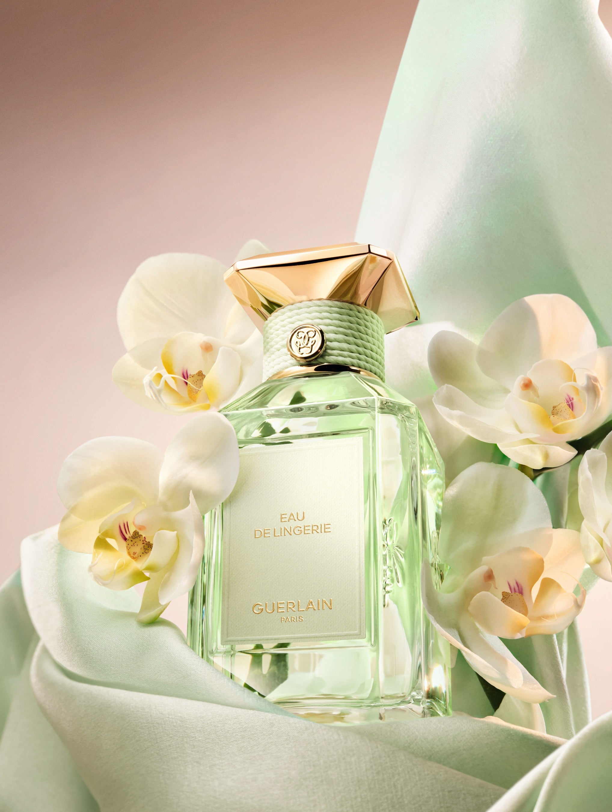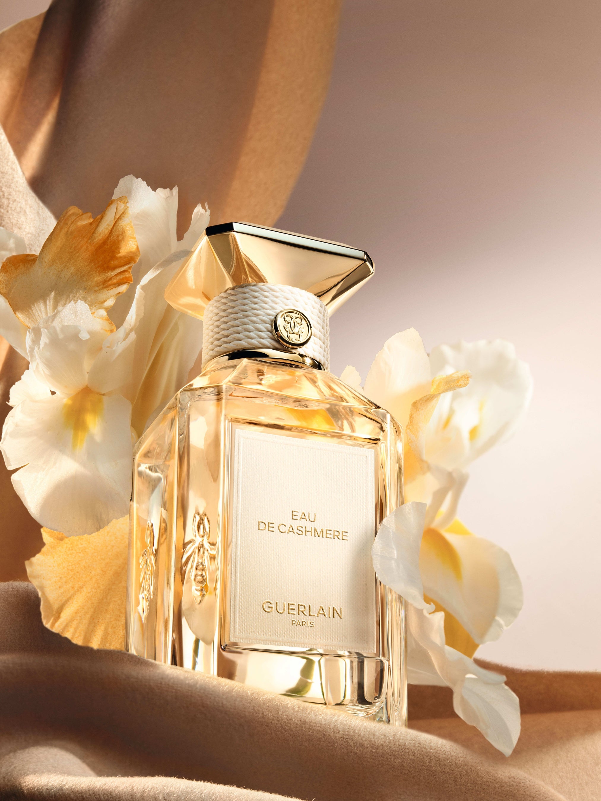 やわらかさと素材の対話をテーマとしたこのコレクションのために、ゲランは〈ラール エ ラ マティエール〉のアイコニックなボトルを再解釈しました。〈ラール エ ラ マティエール レ ゾー〉コレクションの各フレグランスには、それぞれの素材を象徴するパステルトーンのカラーが添えられています。カシミアラップのベージュ、ポプリンのイエロー、サテンパジャマのアーモンドグリーン、コットンキャンバスのピンク、花嫁のヴェールを思わせるピュアホワイト。テクスチャーのあるテキスタイル調のラベル、ネックを囲むコットンコード、そしてキャップを飾るセラミック調のフラットカラーが、それぞれの香りの色彩を際立たせます。