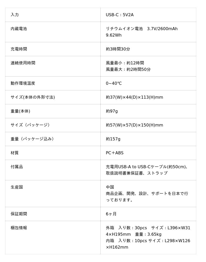 重さはわずか約97gの軽さなのに、最大12時間の連続使用が可能です。(※風量最小時の時間です、使用風量により異なります)朝から夜まで、これ1台で一日中涼しさをキープできます。