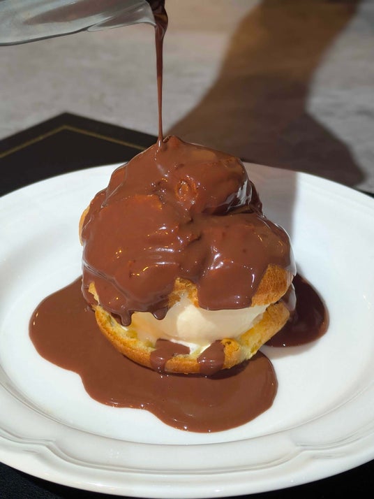 (アイスを詰めたシューに温かいチョコレートソースをかけたデザート)