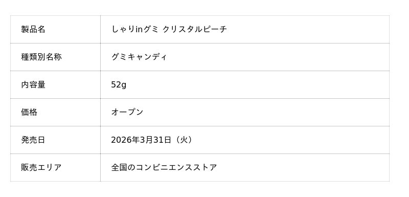 『しゃりinグミ クリスタルピーチ』を3月31日(火)より全国のコンビニエンスストアで期間限定販売しますので、お知らせします。