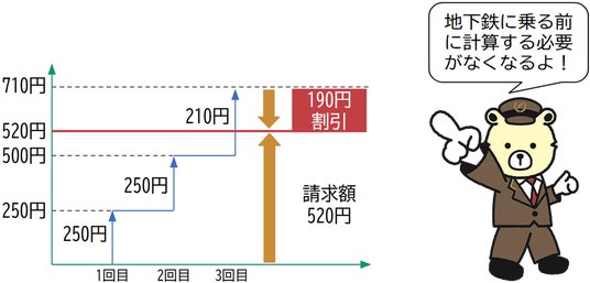 札幌市営地下鉄で「クレカ乗車」をご利用いただいた場合、当日の利用料金を累積し、平日は830円(地下鉄専用1日乗車券相当額)、土日祝・年末年始は520円(ドニチカキップ相当額)に到達した場合、それ以降の乗車料金が発生せず、自動的に乗り放題となるサービスです。