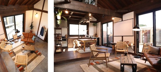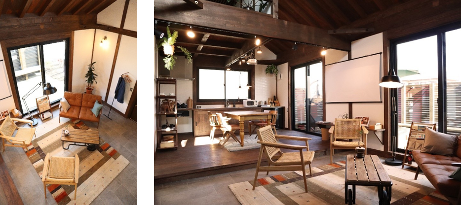 (左)玄関を開けてすぐ広がる土間リビング。誰もが気軽に立ち寄り会話もはずみます。 (右)エボニーの木部が落ち着いた雰囲気を演出するLDK。大画面のスクリーンで家族や友人と映画鑑賞を楽しめます。
