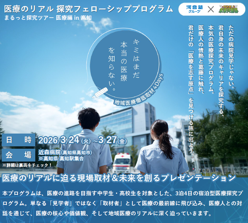 近森病院では、河合塾グループの株式会社KJホールディングスが企画する宿泊型の探究学習プログラム「医療のリアル 探究フェローシッププログラム/まるっと探究ツアー医療編 in 高知」に対し、3月24日(火)~27日(金)の4日間で受け入れ協力を実施します。