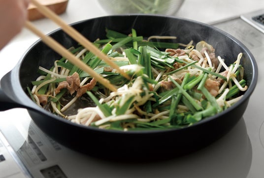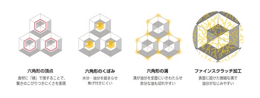新たに施した「ファインスクラッチ加工」により、食材自体がもつ油分を最大限に活かし、少ない油でもこびりつきにくくヘルシーに調理できます。毎日のお料理を快適にするこだわりの形状です。