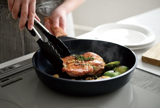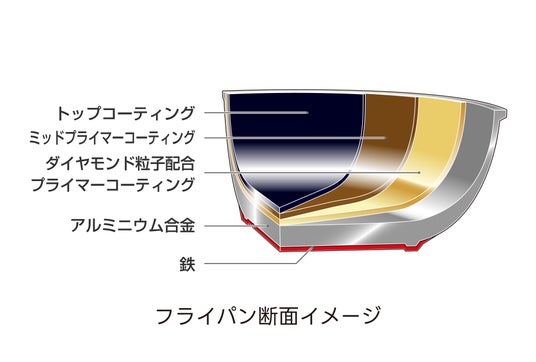 創業以来こだわってきた「PFOA・PFOS 不使用」はそのままに、ダイヤモンド粒子を配合した新開発の「ファインダイヤモンドコーティング PLUS」は、200 万回の耐磨耗試験をクリア。高い耐久性を誇ります。食材がこびりつきにくく、お手入れも簡単で、毎日の料理でも安心してお使いいただけます。