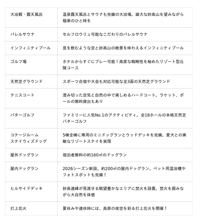 2026シーズンより、広大な敷地と四季折々の資源を活かした「滞在型自然体験」をスタートします。「自然を無理なく、確実に楽しむ」をコンセプトに、季節に合わせて気軽に参加できるメニューをご用意しています。満天の星空観賞や昆虫採集、山菜採りなど妙高の大自然の中でしか味わえない非日常な体験をお楽しみください。また、屋内ドッグランや天然芝グラウンドのほかにも当施設にはゴルフ場、バレルサウナ、インフィニティプール、テニスコート、パターゴルフなど多彩な施設・アクティビティを揃えています。お客様の滞在目的に合わせ、大自然の静寂とアクティブな高揚感の両立を実現します。日常を離れ、心身ともにリフレッシュできる特別なひとときを、ここ妙高の地で心ゆくまでご堪能ください。