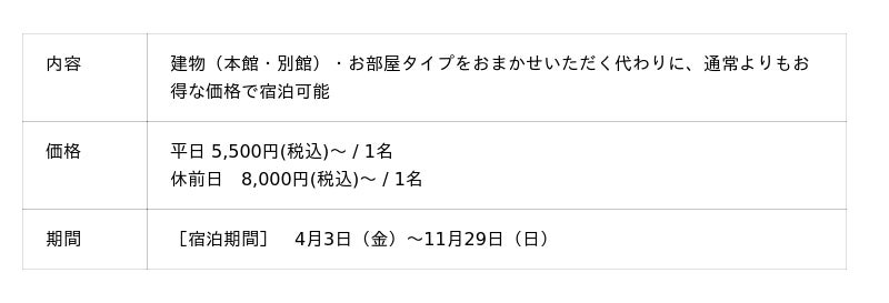 出張や1人旅におすすめ!部屋タイプおまかせシンプルステイプラン(素泊まり限定)