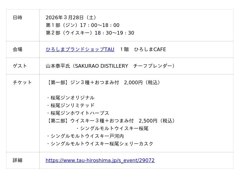 ひろしまブランドの発信拠点「ひろしまブランドショップ TAU」では、3月28日(土)に、「SAKURAO BREWERY & DISTILLERY プレミアム試飲会」を開催します。