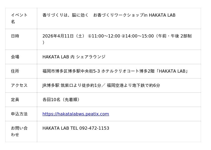 福岡市を拠点とする無添加手づくりお香ブランド「CRYSTAL INSENSE(クリスタルインセンス)」(運営:キャンプ女子株式会社)は、2026年4月11日(土)、博多駅筑紫口徒歩30秒に4月1日オープンする新しい複合ワークスペース「HAKATA LAB」のシェアラウンジにて、お香づくりワークショップを初開催いたします。午前・午後の2部制(各回定員10名)で、参加費は2,000円(税込)。福岡県産の椨(タブ)粉や八女杉など九州の天然素材に実際に触れながら、アップサイクル素材を活用したコーン型お香づくりを体験いただけます。申し込みはこちら:https://hakatalabws.peatix.com