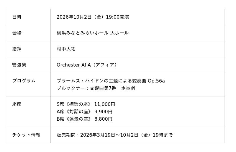 2026年10月2日(金)に横浜みなとみらいホールにて、村中大祐指揮 Orchester AfiA「自然と音楽」コンサートシリーズ Vol.14 開催決定