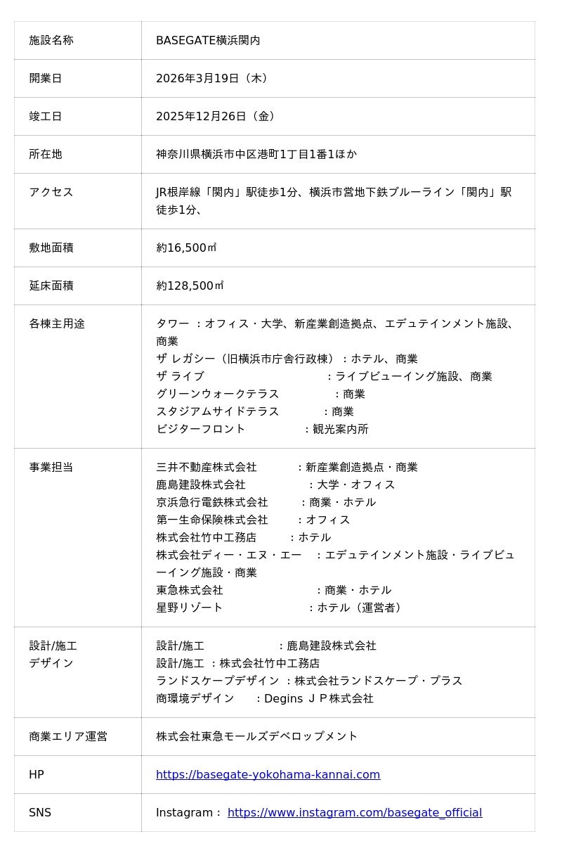 三井不動産株式会社(以下「三井不動産」)を代表企業とする、鹿島建設株式会社、京浜急行電鉄株式会社、第一生命保険株式会社、株式会社竹中工務店、株式会社ディー・エヌ・エー(以下「DeNA」)、東急株式会社、星野リゾートの8社は、2026年3月19日(木)11時に「BASEGATE横浜関内」を開業いたしました。