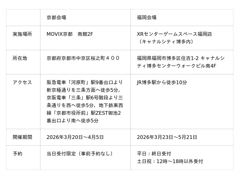 また、福岡会場はキャナルシティ博多内の「XRセンターゲームスペース福岡店」にて、2026年3月23日から5月21日まで開催。平日は終日、土日祝は12時から18時を除く時間帯で体験可能となっており、ライフスタイルに合わせてお楽しみいただけます。