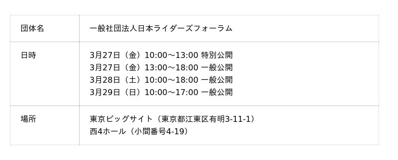 一般社団法人 日本ライダーズフォーラム(本社:東京・渋谷区、代表:風間深志)は、「SSTR(サンライズ・サンセット・ツーリングラリー)」として2026年3月27日(金)から29日(日)まで東京ビッグサイトで開催される「第53回 東京モーターサイクルショー」に初出展いたします。