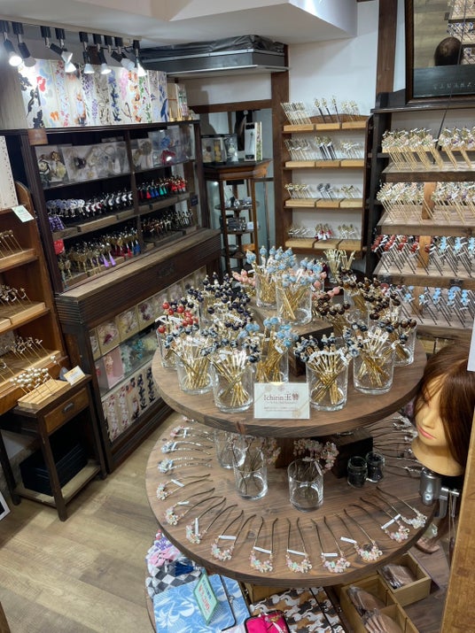 一点一点趣向を凝らした手作りのかんざしは、簡単に挿すだけで印象的なヘアスタイルを完成させることができ、日常使いから観光時の装いのアクセントまで幅広く活用いただけます。