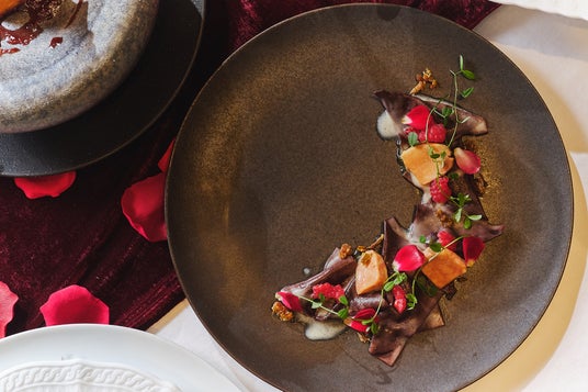 温前菜は、ひよこ豆の生地を揚げたイタリアの伝統料理パニッサに、薔薇に見立てた生ハムを添えました。パスタは、カカオを練り込んだ三角形のパスタトリアンゴリにバラとリコッタを詰め、フォアグラのテリーヌでコクを添えます。リゾットはバラとイチゴ、ピスタチオを合わせ、香りと彩りの調和を表現しました。