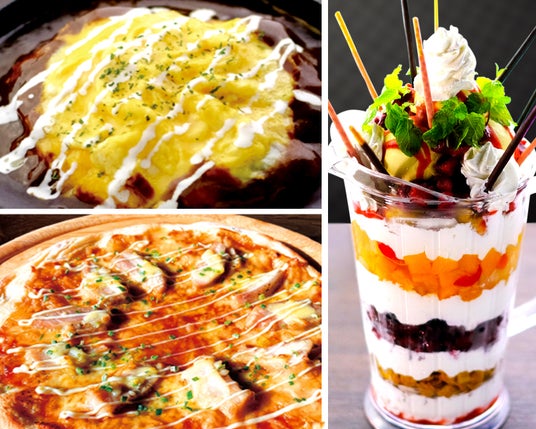 「Beeデミグラスオムライス」「TERIYAKIチキンピザ」「爆盛り2リットルパフェ」