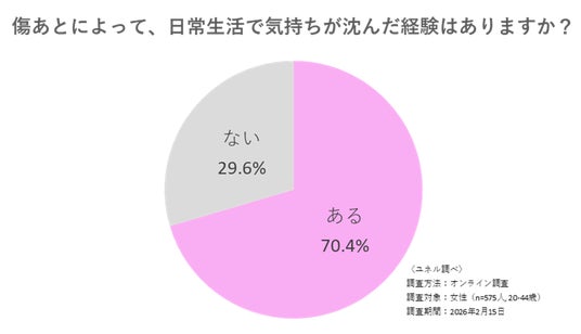 傷跡を持つ女性のうち70.4%が「傷跡によって日常生活で気持ちが沈んだことがある」と回答。具体的な場面を聞くと、「人に見られるのが気になった」(62.7%)、「鏡を見るのが嫌だった」(46.4%)、「写真を撮るのが嫌だった」(24.4%)、「外見について何か言われた」(15.3%)と続き、外見への悩みが行動や自己表現にまで影響している実態が浮かび上がりました。