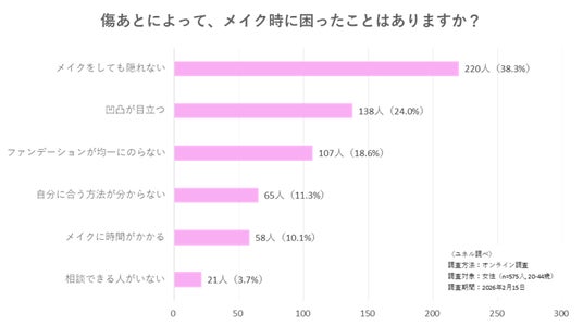 傷跡を持つ女性の55%が「メイク時に困ったことがある」と回答。具体的な悩みとして最多は「メイクをしても隠れない」(38.3%)でしたが、「凹凸が目立つ」(24.0%)、「ファンデーションが均一にのらない」(18.6%)など、凹み特有の悩みが上位を占めています。こうした凹み関連の悩みは合計で全体の約半数を占めており、既存の化粧品では対応が難しいと感じている領域があることが示されました。