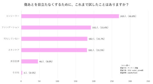 傷跡を目立たなくするために試したことを聞くと、「コンシーラー」(46.8%)が最多であるものの、「何もしていない」(31.7%)という回答が3人に1人にのぼりました。手段を知らない、あるいは試しても効果がなかったために諦めているという実態が浮かびます。