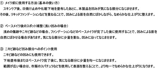 特別なテクニックは必要なく、普段のメイクに手軽に取り入れることができます。厚塗りになりにくく、凹みをカバーしながら自然な仕上がりのメイクをサポートします。