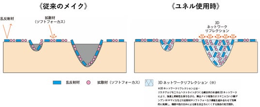 図. 従来のメイクアプローチと、 ユネルの「3Dネットワークリフレクション」構造イメージ