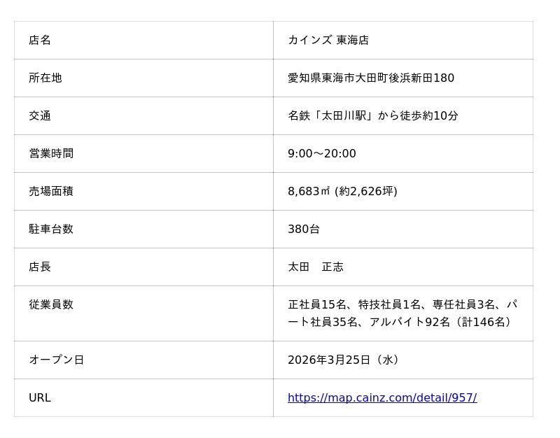 株式会社カインズ(本部:埼玉県本庄市、代表取締役社長 CEO:高家 正行)は、カインズ 東海店が2026年3月25日(水)に、愛知県東海市にグランドオープンすることをお知らせします。