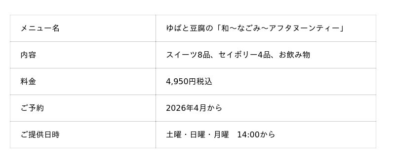 ゆばと豆腐の「和~なごみ~アフタヌーンティー」への申し込みは、下記「和アフタヌーンティーご予約ページ」から可能です。メニュー提供は4月から毎週、土曜・日曜・月曜の14時~完全予約制となっております。ご予約ページから日程をご確認の上、お申し込みください。