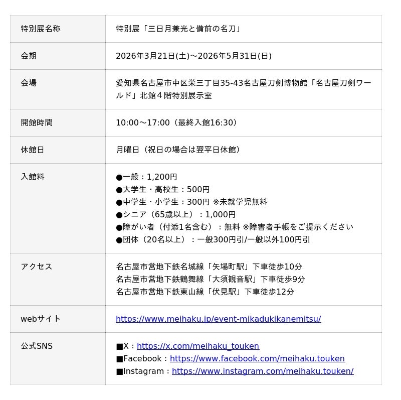 名古屋刀剣博物館「名古屋刀剣ワールド」(愛知県名古屋市、以下当館)では、2026年3月21日(土)から5月31日(日)まで、特別展「三日月兼光と備前の名刀」の開催に合わせ、新たなミュージアムグッズの販売および特別企画を実施いたします。