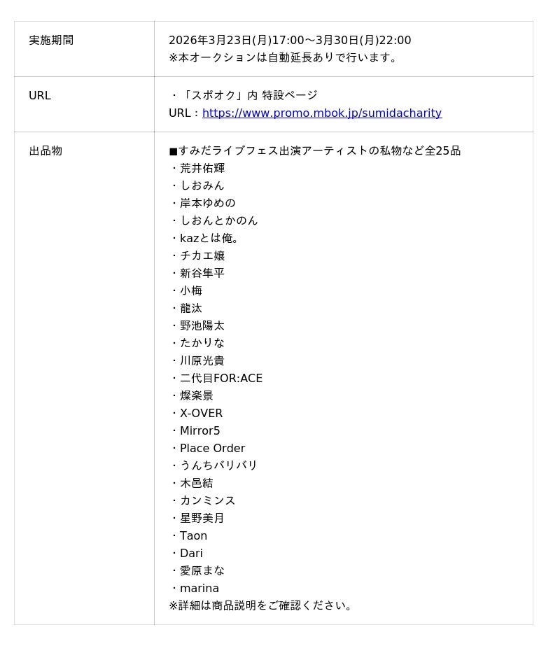 株式会社モバオク(本社:東京都渋谷区、代表取締役社長:小一原 宏樹、以下モバオク)が運営するオークションサービス「モバオク」にて、一般社団法人ピースライブ(本社:東京都墨田区、代表理事:大友健、以下ピースライブ)が主催する「すみだライブチャリティーオークション2026春」を、2026年3月23日(月)から開始します。