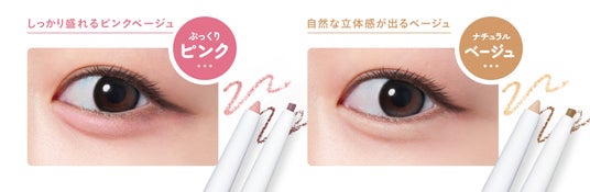 ハイライトペンシル部分のピンクカラーが涙袋を作り、影ペンシルのモーヴカラーが目元を強調し、ぷくっとした立体感のある仕上がりに。