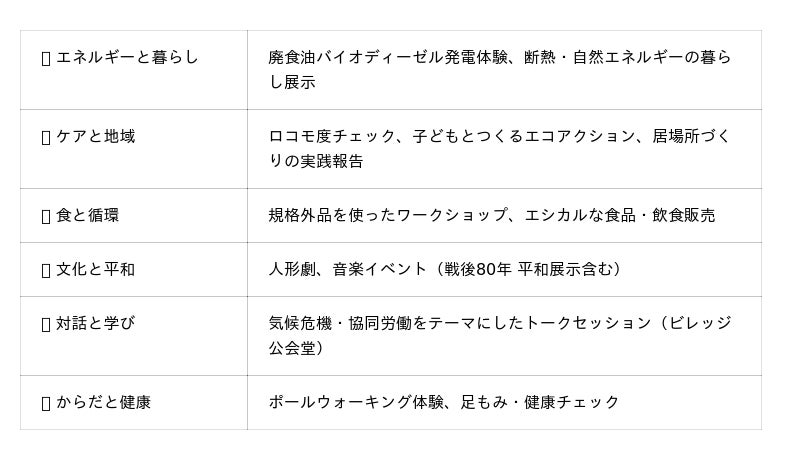 2025年のビレッジでは「一緒につくろう!人も自然もつなぎつながる『わ』」をコンセプトに、12ブース・10ミニステージを展開。廃食油発電体験や規格外の花を使ったワークショップ、手作り菓子販売などが人気を集めました。