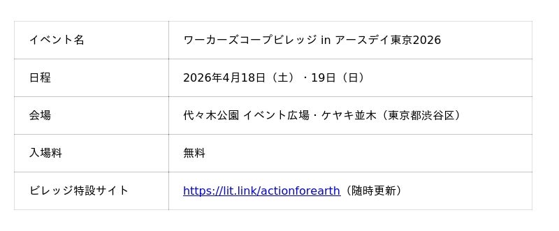日本労働者協同組合(ワーカーズコープ)連合会は、日本最大級の環境フェスティバル「アースデイ東京2026 (https://www.earthday-tokyo.org/)」において、今年も「ワーカーズコープビレッジ」を出展することを決定しました。昨年も多くの来場者で賑わったビレッジが、今年もパワーアップして帰ってきます。