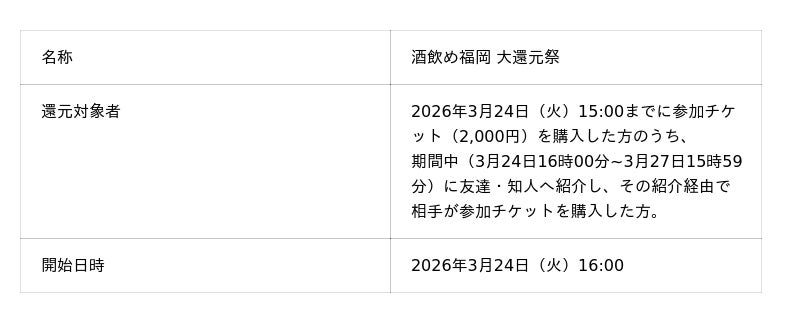 100店舗参加の福岡最大級ハシゴ酒フェス『酒飲め福岡』開催中、2,000円の参加チケットに対して1,500円分を還元する72時間限定『酒飲め福岡 大還元祭』を3月24日16:00より開始