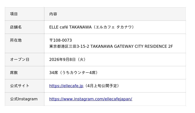 ラ・メゾン・ホスピタリテ株式会社(本社:東京都中央区、代表取締役:磯 綾一郎)は、株式会社ラガルデール アクティブ エンタープライズ ジャパン(日本支社:東京都港区、CEO:アンヌ・ビラズ)とライセンス契約のもとで展開する「ELLE cafe TAKANAWA」を、2026年9月8日(火)、東京都港区三田のTAKANAWA GATEWAY CITY RESIDENCE 2Fにグランドオープンいたします。