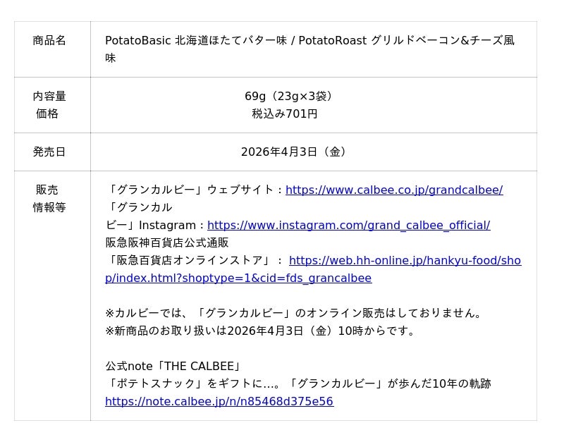 カルビー株式会社(本社:東京都千代田区、代表取締役社長兼CEO:江原 信)は、阪急うめだ本店(大阪府大阪市)で展開している“ギフトにしたいポテトスナック”を扱う「グランカルビー」より、新商品として『PotatoBasic 北海道ほたてバター味』『PotatoRoast グリルドベーコン&チーズ風味』を、2026年4月3日(金)から発売します。